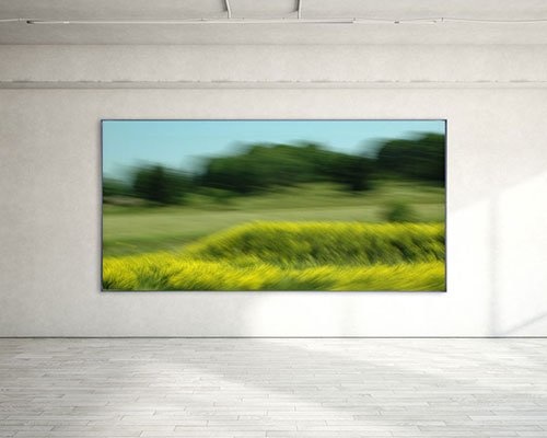 Das Akustikbild "Sommerwiese" von Jennifer Scales im Panoramaformat wirkt modern und dynamisch. Gerade in belebten Räumen eignet sich dieses hochwirksame Schallschutzbild als Blickfang mit künstlerischem Anspruch.